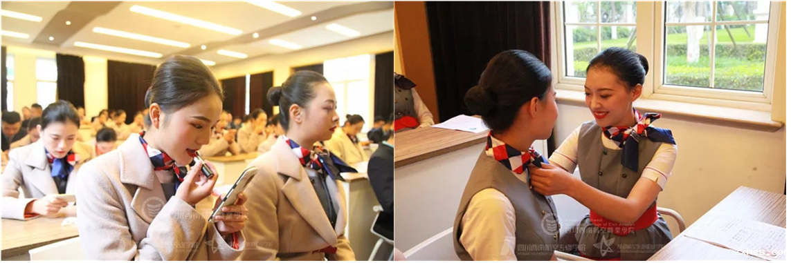 海选过后的初试环节则更加注重专业能力及语言能力。自我介绍、英语口语、才艺展示、快问快答……每一位学子都尽全力向面试官展现出自己最优秀的一面,“经历过就无憾了,不管结果如何,我都会继续努力奋斗。因为我始终怀揣着我的蓝天梦!”空中乘务专业学生蒲可欣说。