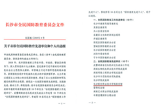 近日,长沙市全民国防教育委员会全体(扩大)会议在长沙警备区召开,会上表彰奖励了全市国防教育先进单位和个人,我院航空馆荣获长沙市“全民国防教育先进单位”称号。