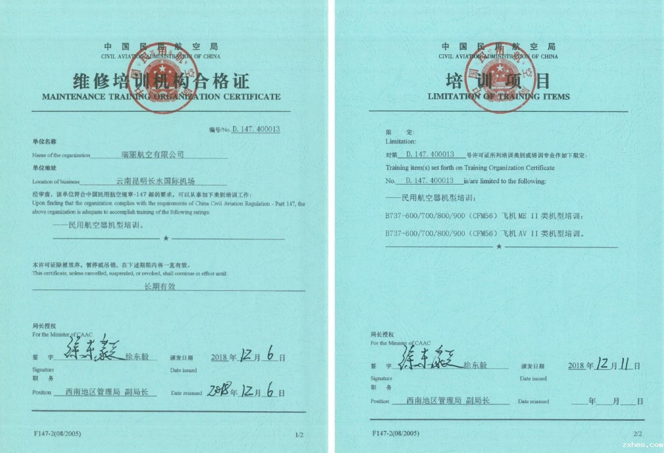 2018年12月11日,瑞丽航空顺利取得CCAR-147维修培训机构资质。