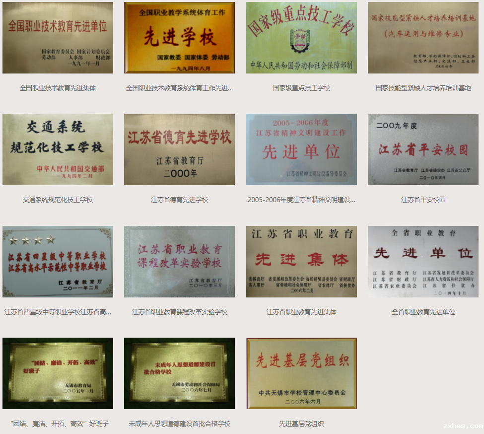 近年来,学校共取得省赛95金147银163铜、国赛23金13银1铜(其中全国冠军5名)的辉煌成绩,连续多年被评为“江苏省职业院校技能大赛先进单位”。学校现为“首批江苏省高水平现代化职业学校”、“江苏省四星级中等职业学校”、“江苏省课改实验学校”、“国家技能型紧缺人才培养培训基地”、“国家交通职业技能鉴定所”、“江苏省建筑行业特种作业人员培训考核基地”、“无锡市特种车辆培训基地”、“宝马集团BEST无锡培训基地”、“上海通用ASEP项目培训基地”、教育部校企合作项目“PPG示范联合培训中心”、“奔腾ARS汽车维修实训中心”。学校先后被上级部门授予“江苏省文明单位”、“江苏省职业教育先进单位”、“江苏省德育先进学校”、“江苏省平安校园”、“江苏省绿色学校”、“江苏省教育工作先进集体”、“江苏省文明校园”等荣誉称号。